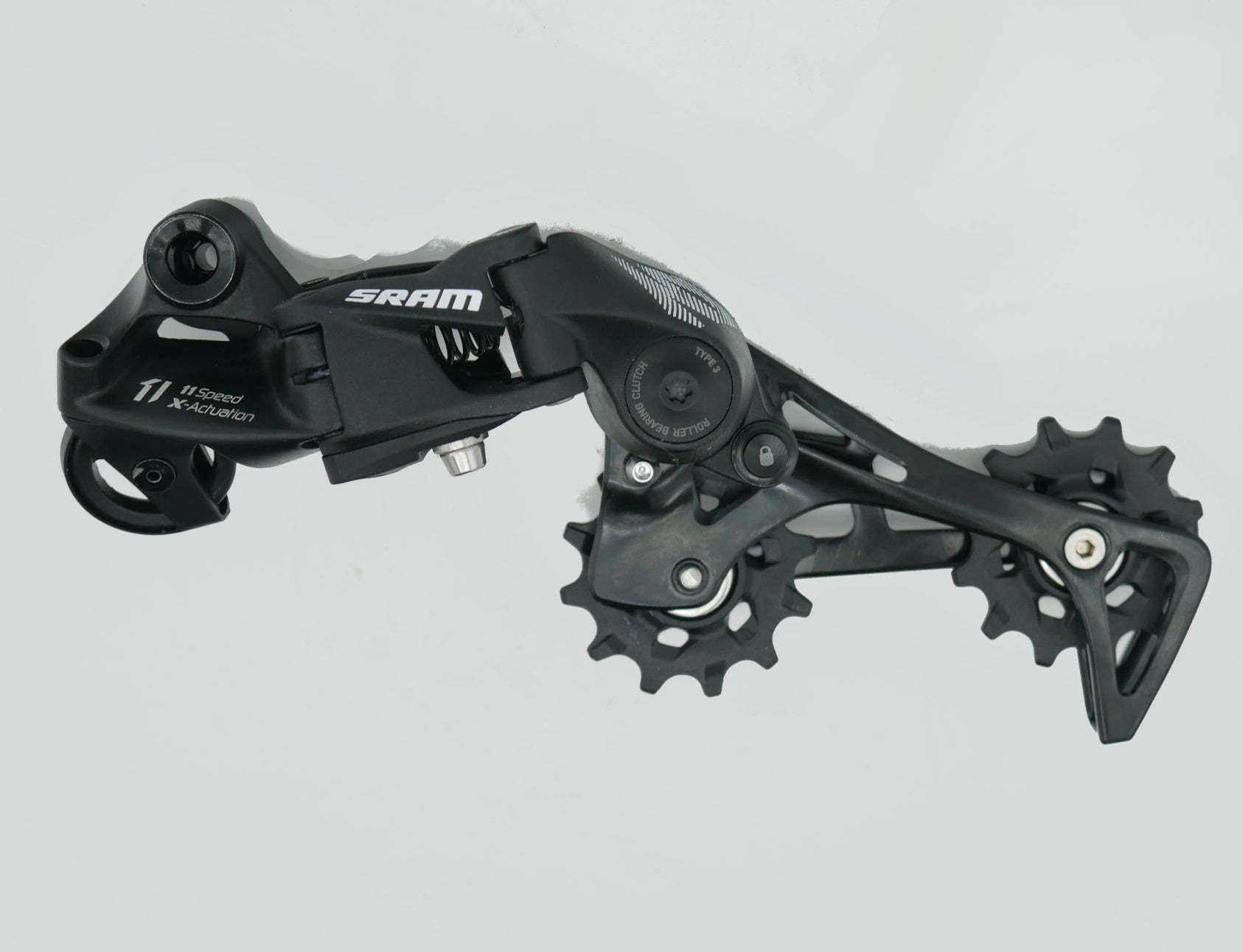 The SRAM NX 11-speed derailleur delivers reliable shifting performance with its long cage design, accommodating up to 42-tooth sprockets for versatile gear ratios. Built with steel construction throughout—including the cage and pulley bearings—this derailleur offers durability and consistent engagement across your drivetrain. The X-actuation cable pull ratio ensures precise indexing with SRAM's 11-speed shifters, making it an excellent choice for trail riding and varied terrain where dependable gear changes matter.