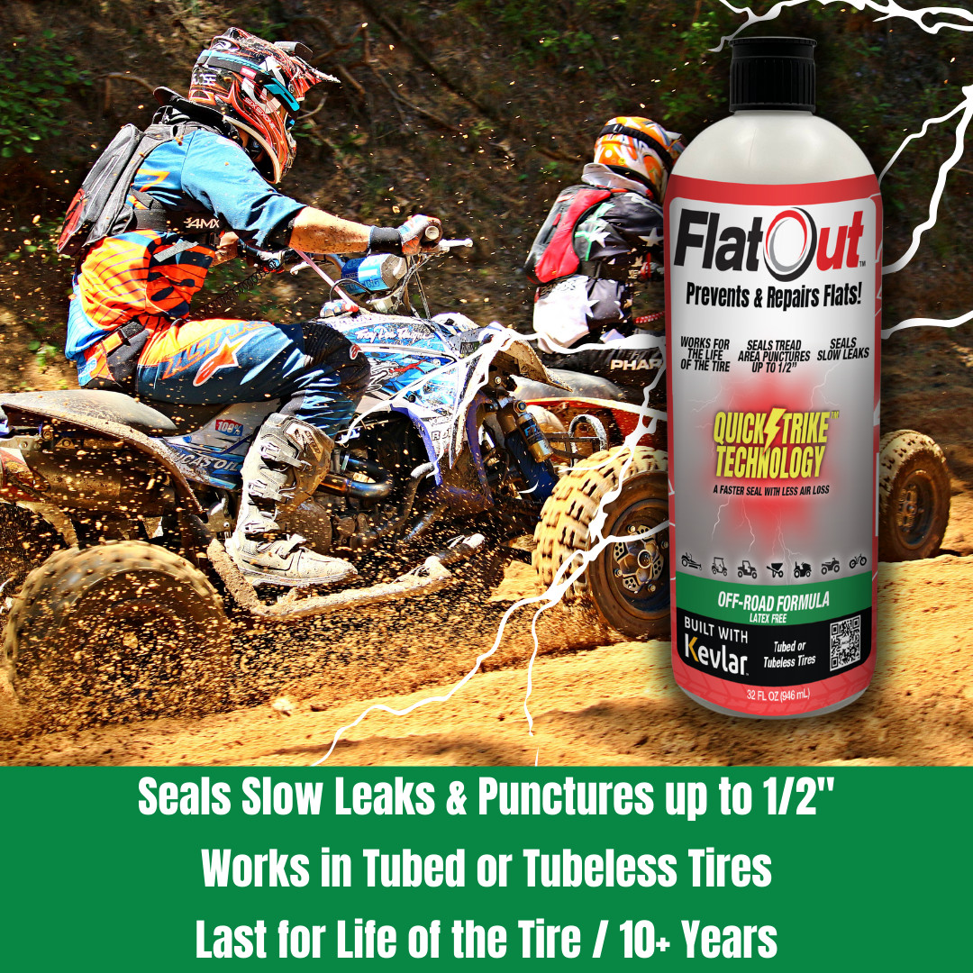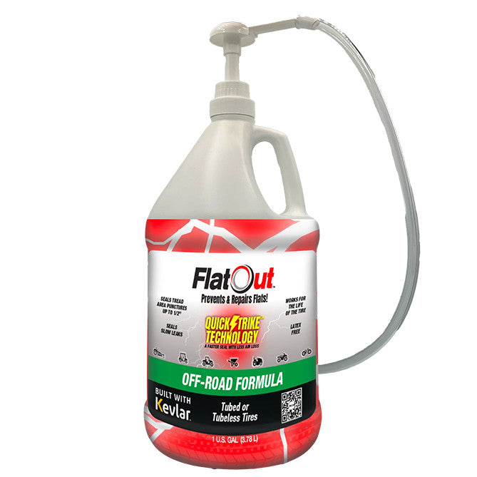 Keep your eBike rolling smoothly with the FlatOut QuickStrike Off-Road Tire Sealant! This innovative formula is engineered for off-road adventures, flowing to punctures quickly when there's no air to spare, making installation a breeze. With double the performance of the competition, it provides a one-time application that lasts the life of your tire, sealing tread area punctures up to ½” and virtually eliminating slow leaks. Enhanced with super-strong Kevlar fibers, this sealant is water-washable and free from latex and adhesives, ensuring a clean experience without any sticky mess. Offering 24/7 protection, FlatOut QuickStrike is perfect for fat tire bikes and eBikes with tires wider than 3.5”, allowing you to tackle any terrain with confidence. Don't let punctures slow you down—equip your eBike with FlatOut QuickStrike and ride worry-free!