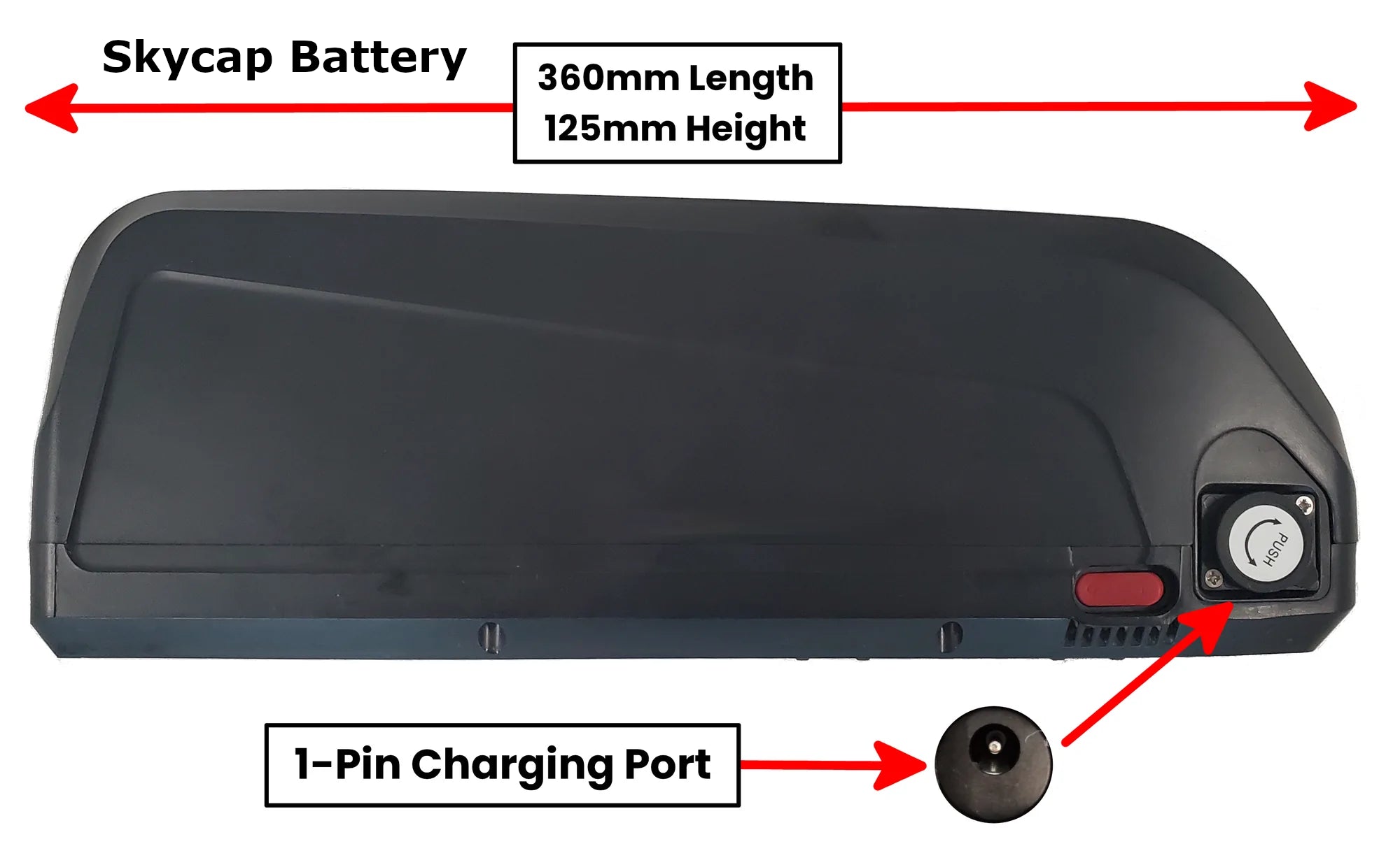 This sleek external battery is a primary and secondary battery on the Biktrix Moto series bikes and as a secondary battery for the Swift CVT and Skycap 2. Use this battery if you want to ride even further than you can with the primary battery! A high-quality design and many power options provide reliable power and range to extend your ride!